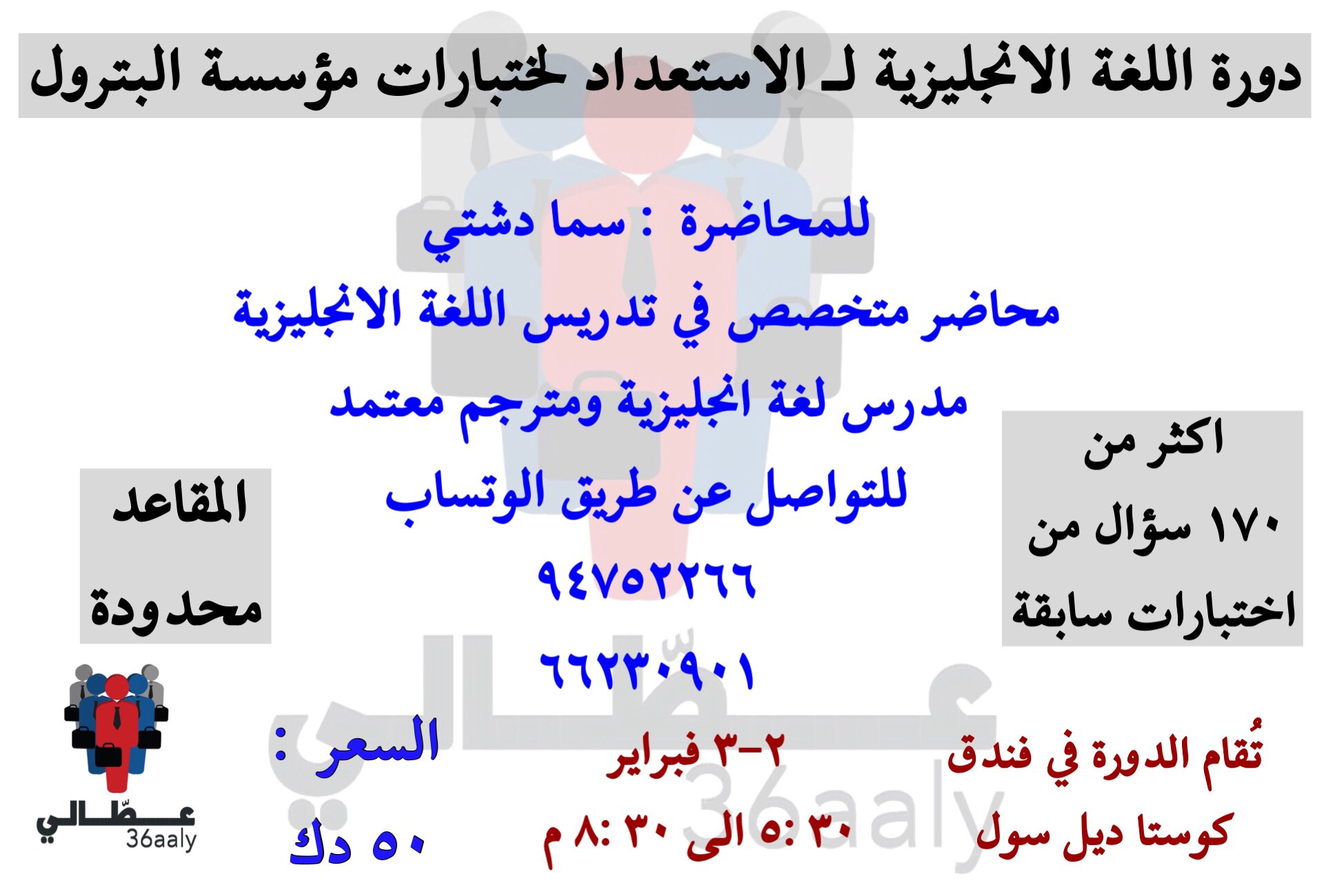 عط الي Auf Twitter دورة الاستعداد لـ أختبار اللغة الانجليزية لمؤسسة البترول الدورة شاملة اختبارات سابقة ومراجعة شاملة لطريقة الاختبار الدورة تقام في ٢ ٣ فبراير الاحد والاثنين في الساعة ٥ ٣٠ الى